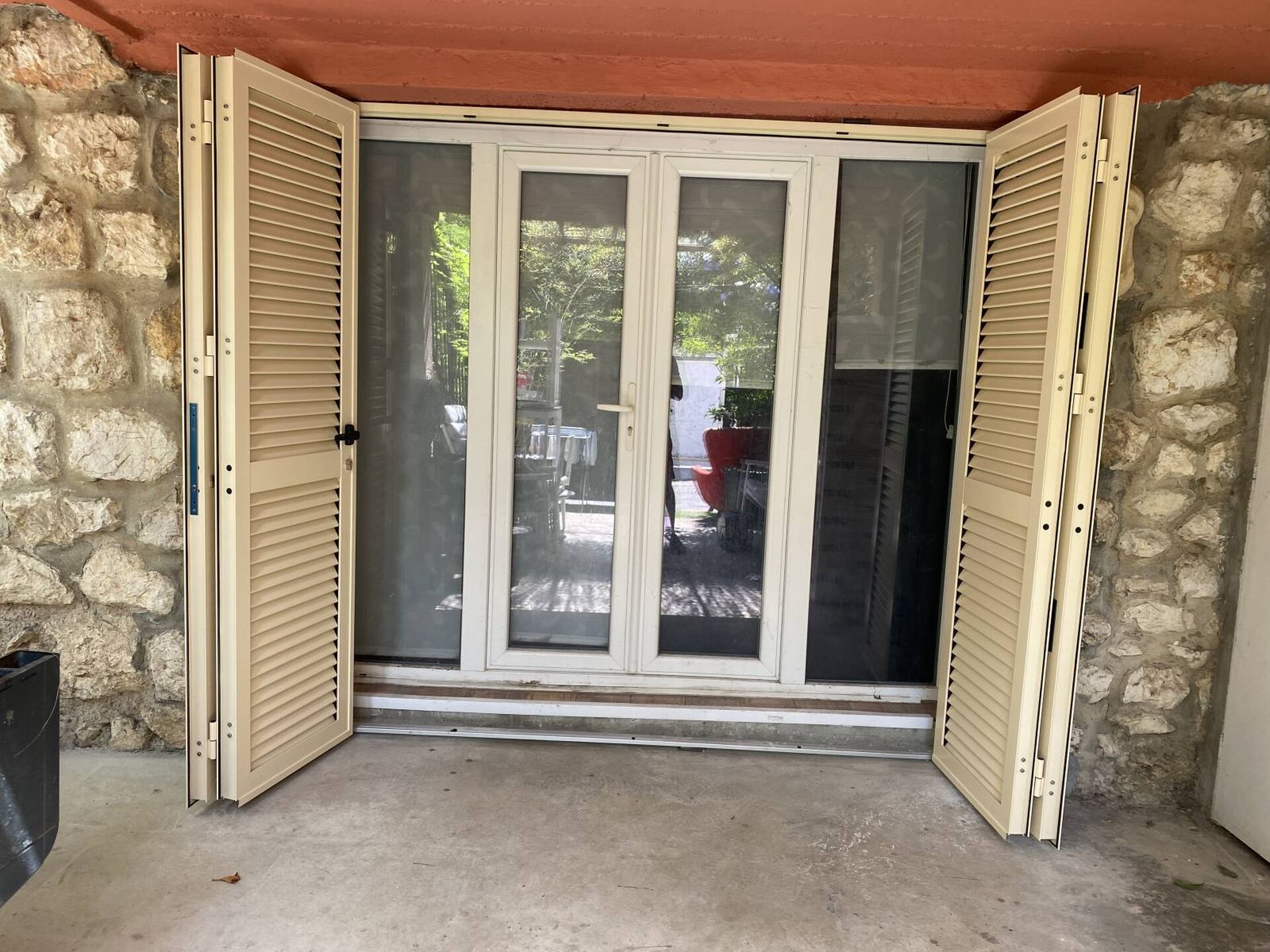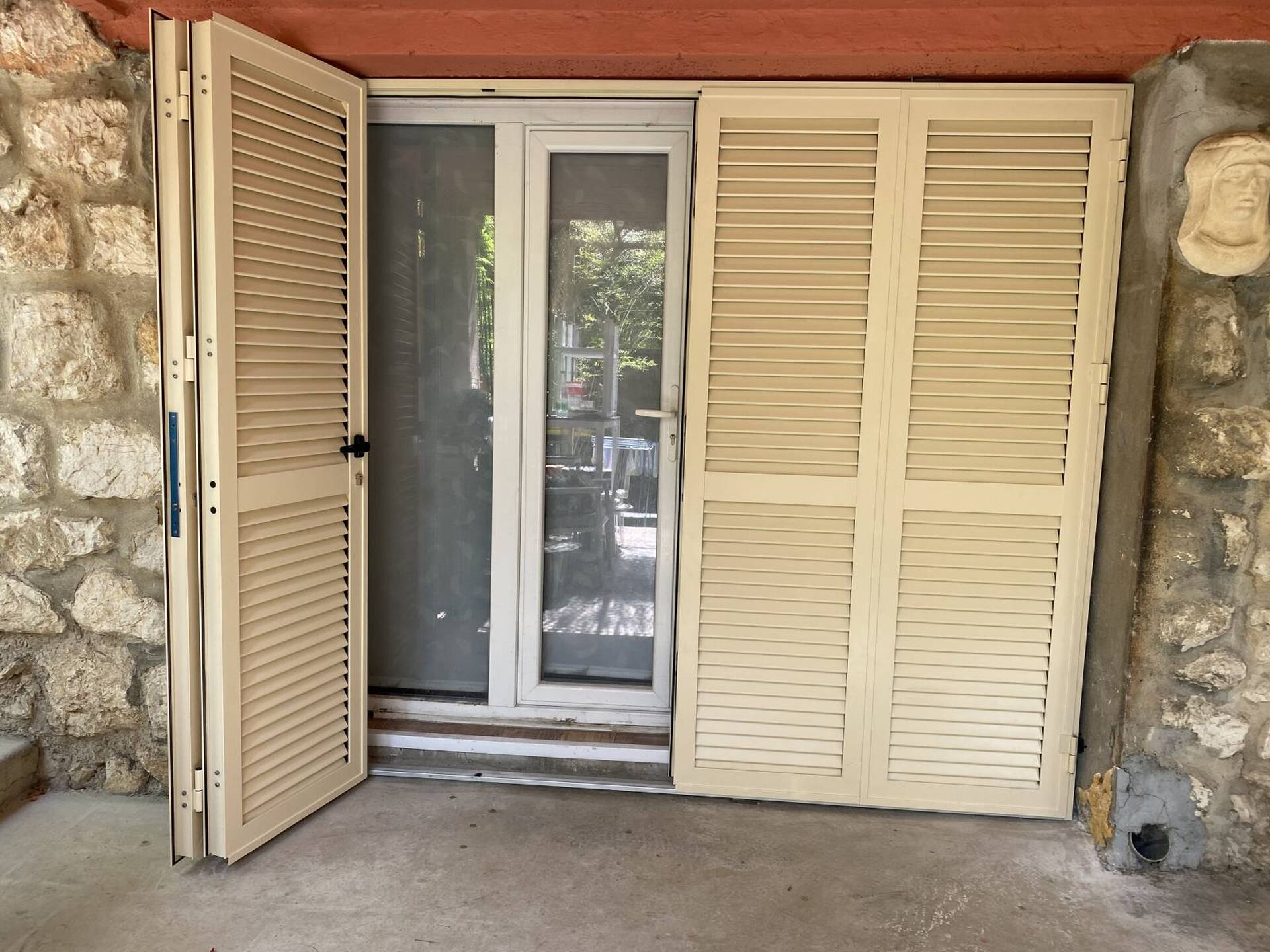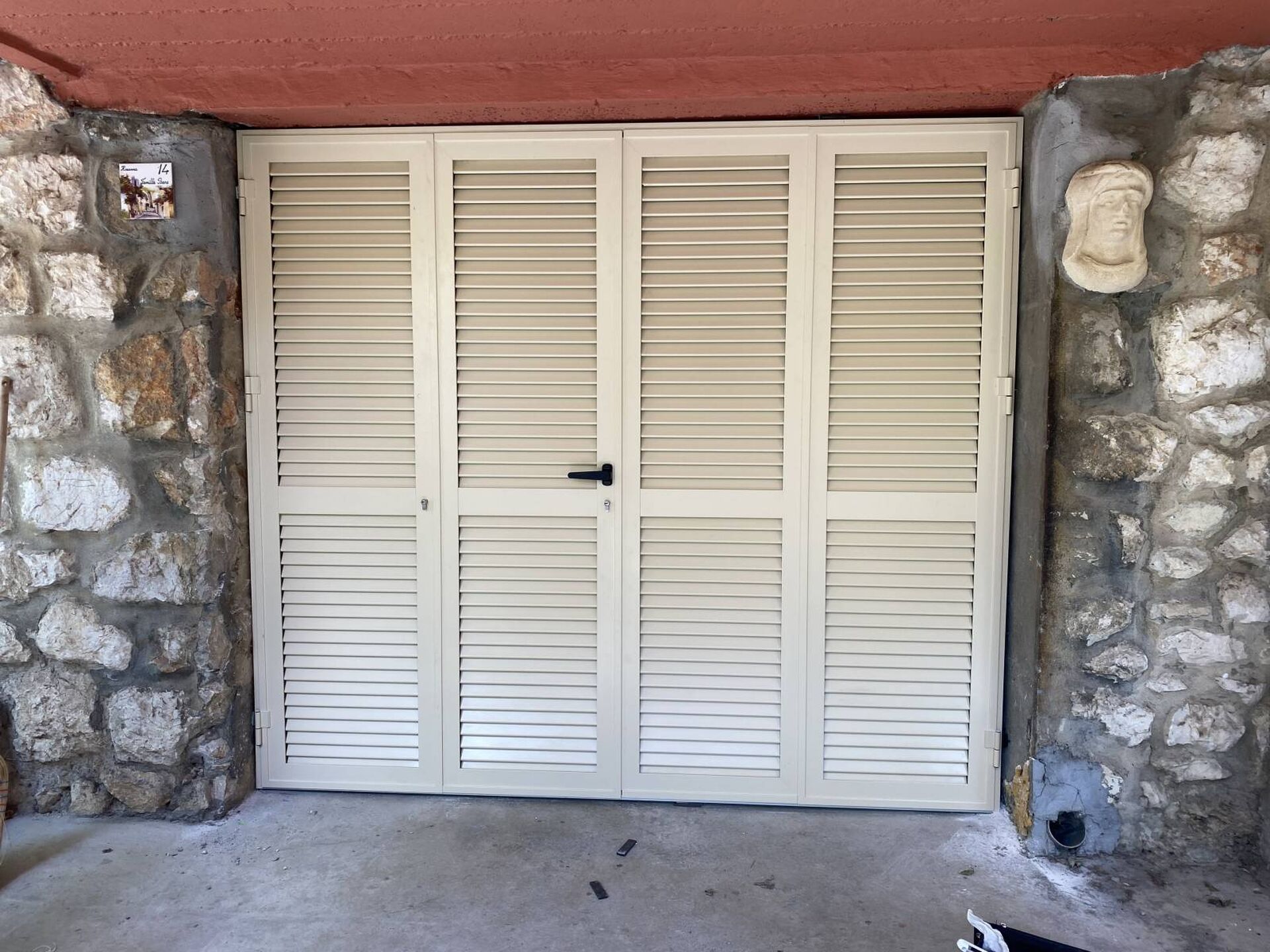 Volet type persiennes à 4 vantaux pliables en deux parties à lames ajourées avec cadre en aluminium .